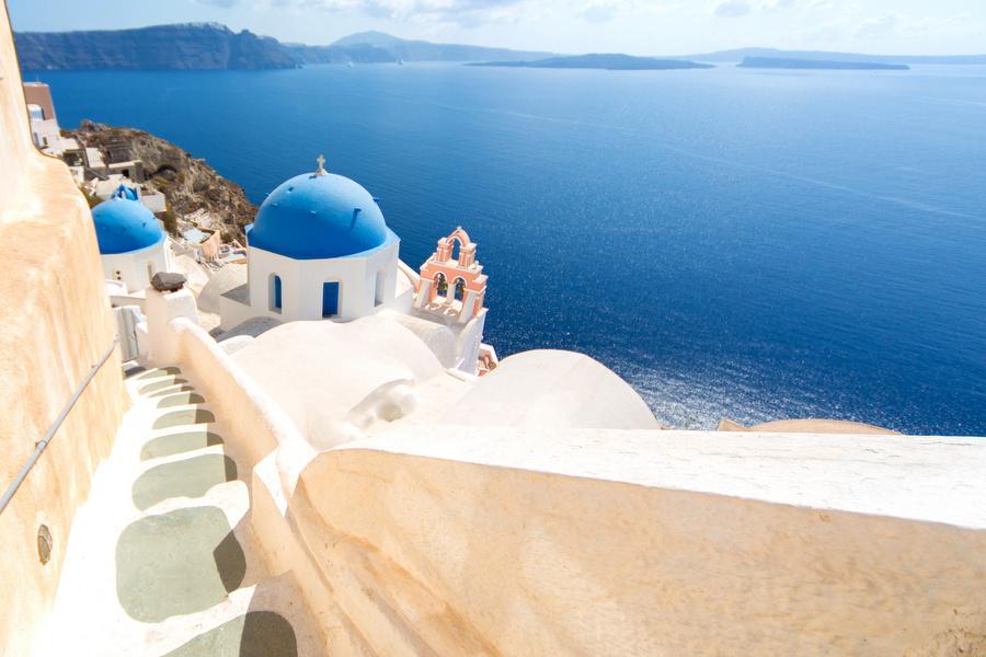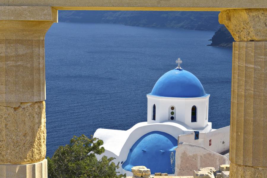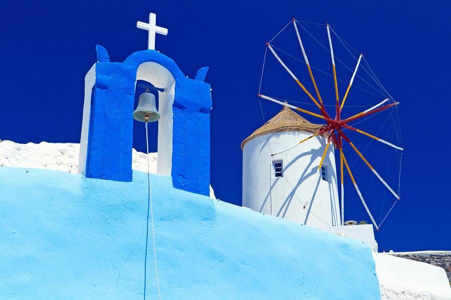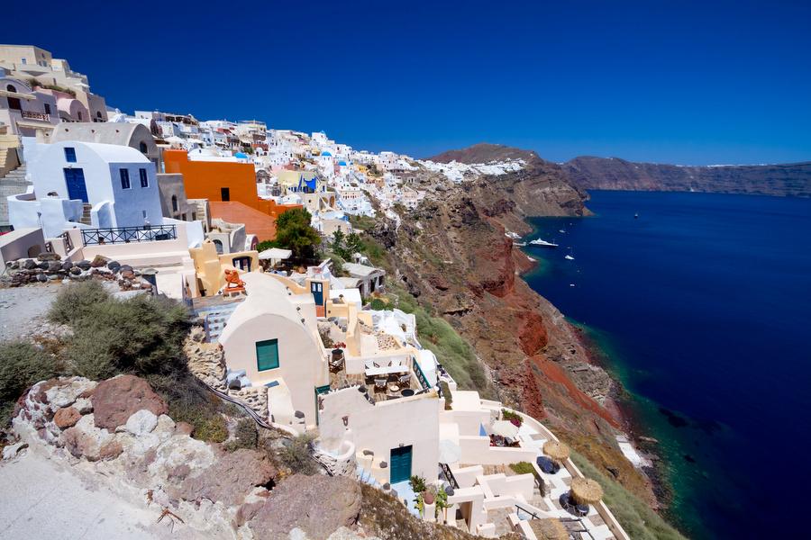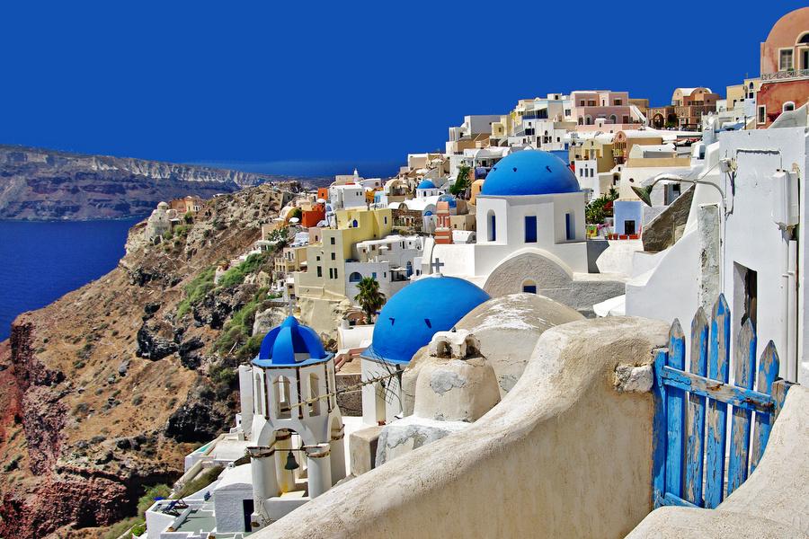 Santorini is high on the to-do list of Greek island hoppers and is formed by several volcanoes. If you approach the island, you have an impressive view of the cliffs rising out of the water whose tops are decorated with bright white houses. The whitewashed houses, blue domed churches and the bare volcanic rocks form a brilliant contrast. That's the reason that Santorini is the most photographed island of Greece.