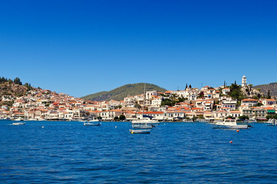 Poros is an island with a surface area of 33 km2 belonging to the Saronic islands. It is located just south of Aegina and is formed by a bridge joining two smaller islands. Poros is green and hilly and has many pine trees. The rugged coastline provide many bays with beautiful beaches.