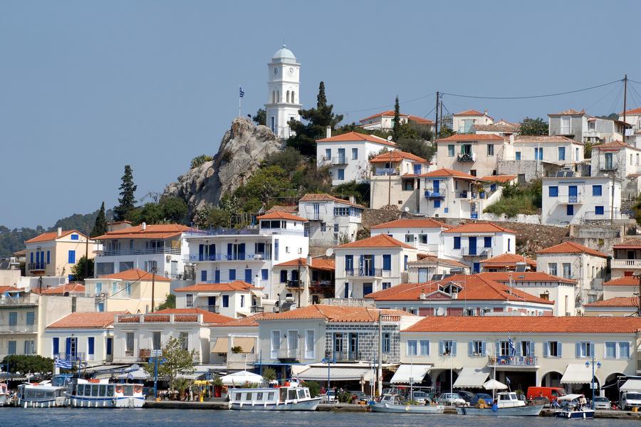 The arrival by ferry is magnificent. In the harbor one sees the wooden fishing boats and the light-colored houses (mostly 19th century) built up against the hills. There are a number of churches and at the highest point of the city is a beautiful bell tower. Poros town is typical Greek with narrow streets and whitewashed steps.