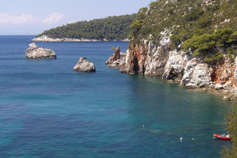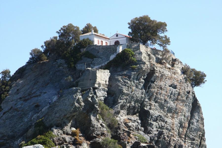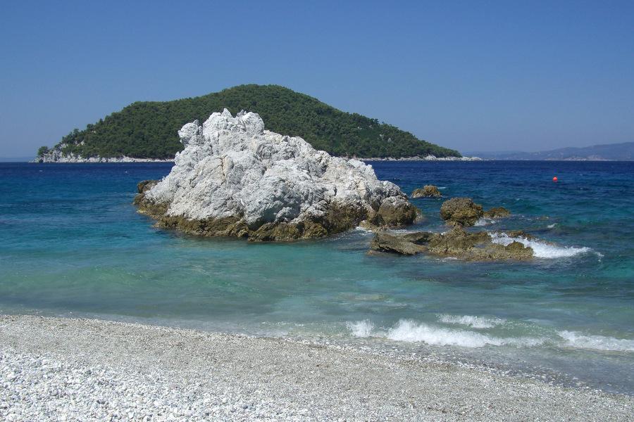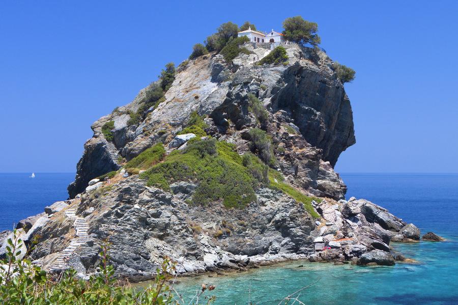 Skopelos has a surface area of approximately 96 km2 and is located between Skiathos and Alonissos. Skopelos is a green, mountainous island with a rugged coastline with steep cliffs and bays with some beautiful beaches surrounded by pine trees and clear blue water. There are up to 8 million pine trees on this island. This was undoubtedly the reason to shoot the majority of the movie Mama Mia (2007) with Pierce Brosnan and Meryl Streep on this island. Make sure to visit the church on the rock by the water where the wedding scene was recorded.