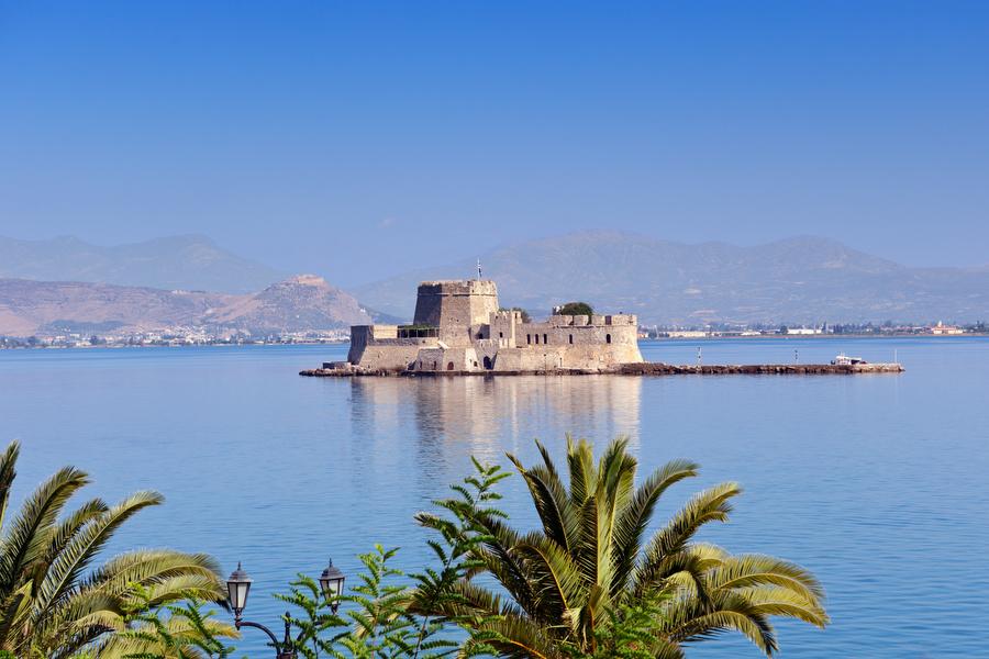 In front of Nafplion, in the water, one finds the island fortress Bourzi which is a Venetian fortress. It's easy to spot from the harbor promenade of Nafplion, but even better from the Palamidi castle up on the hill.